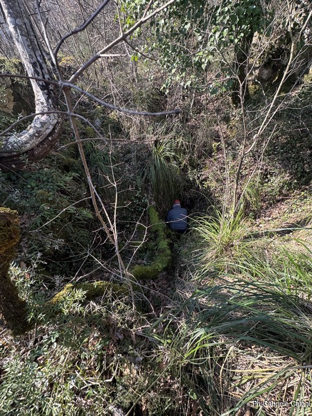 Preparandomi mi guardo intorno. In alto, tra la vegetazione si intravede la parete di roccia…mi sembra ci sia un “nero” interessante, provo a inquadrarlo con lo zoom ma non risolvo molto. Mi annoto mentalmente di chiedere ad Augusto se sono mai stati cercati buchi su questa parete, potrebbero esserci rami fossili della grotta o magari una risorgenza di “troppopieno” che fa, o faceva, defluire le acque in eccesso durante le piene piu’ intense.