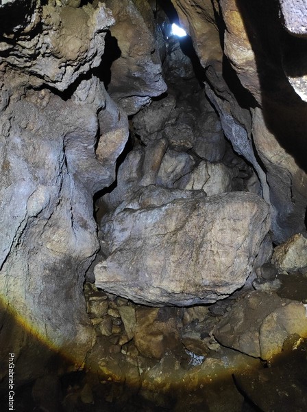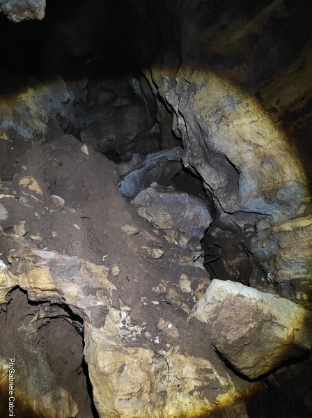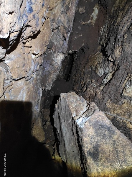 A prima vista in questa minuscola saletta l’unico passaggio sembra essere il piccolo buco evidente che ho di fronte. A sinistra un sasso di buone dimensioni nasconde un saltino di un metro che a prima vista sembra stretto e senza prosecuzioni.