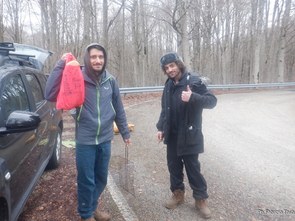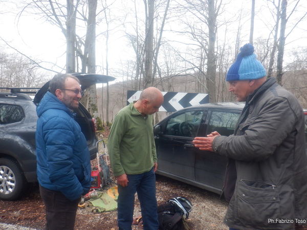 Alla macchina mi cambio indossando abiti asciutti e caldi, poi vado a passeggio lungo la carrabile a vedere di ritrovare altre grotte che mi ero segnato mentalmente. Purtroppo trovo solo un buco che non sembra interessante e poi devo tornare all’auto perche’ i miei amici sono arrivati. Contando che Luca doveva anche disarmare la corda d’ingresso non hanno impiegato molto.