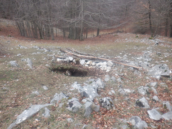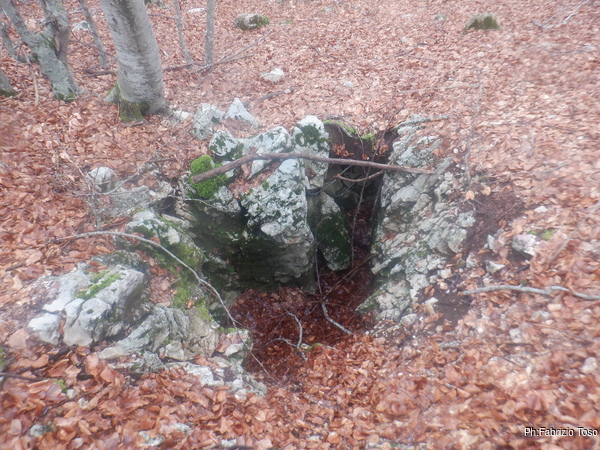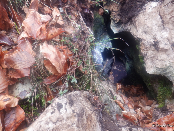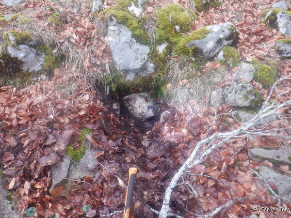 Anche se a malincuore abbandono la mia scoperta e mi dirigo deciso verso un altro possibile buco. Questo pero’ si rivela essere una grotta gia’ conosciuta, si tratta di (LA1610) POZZO AD EST DI POZZO PASQUALITTI, oramai ridotta ai minimi termini.