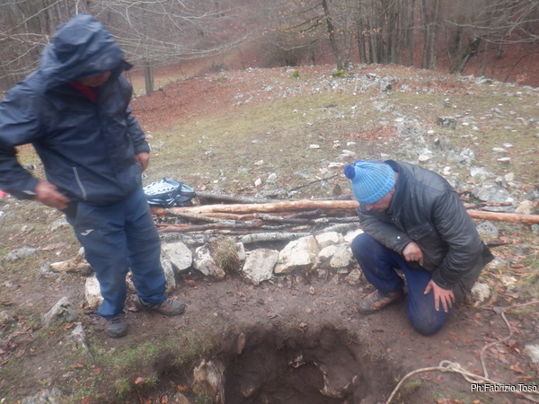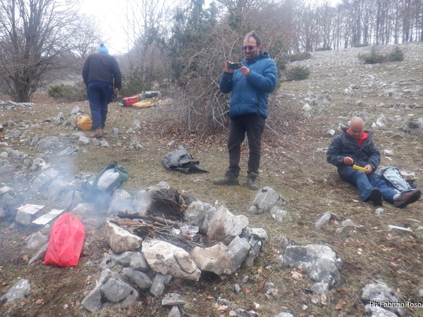 Il lavoro di Luca al pozzo parallelo prosegue meglio che puo’, lo spazio per muoversi e’ davvero poco. Vittorio e’ sceso in fondo al pozzo principale e su nostra richiesta e’ intento a cercare la punta di scalpello che persi la volta scorsa. Il fuoco oramai e’ una realta’ affermata e confortante, la pioggia fine nel frattempo si e’ trasformata in neve. E’ il momento giusto per iniziare con le bruschette. Con l’aiuto di Elia fuochista prepariamo il letto di brace per ospitare la graticola e diamo il via alla bruschettatura del pane.