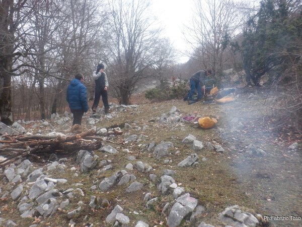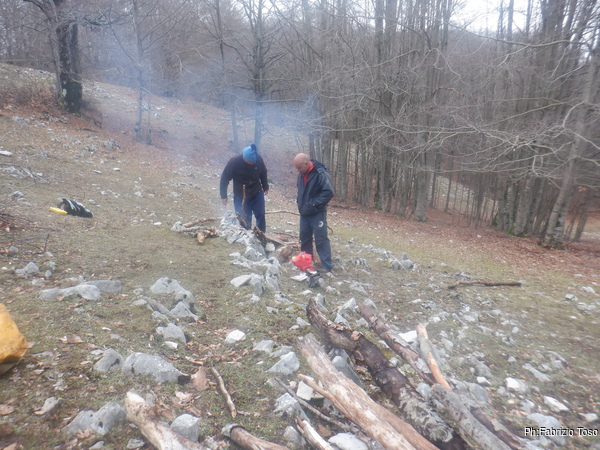 Ha anche acceso il fuoco, elemento indispensabile sia per la programmata bruschetta che per riscaldarci in questa giornata decisamente umida. Si, non l’ho detto, ma il tempo oggi non e’ dei migliori, alterna una pioggerella fine che a tratti tende a trasformarsi in nevischio.