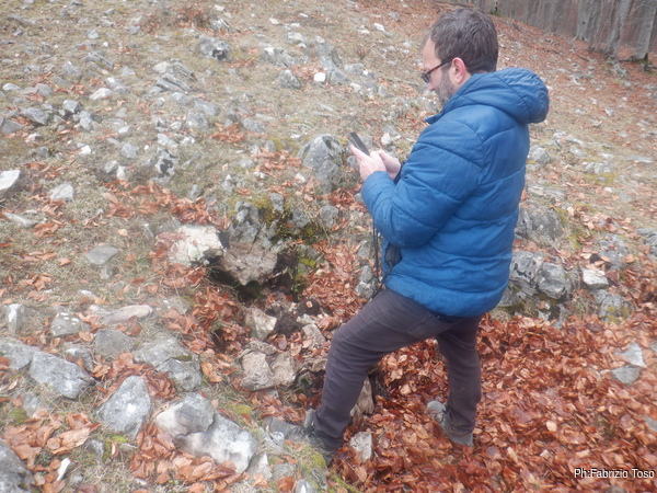 Continuo il mio giro fino a trovare un altro buco, piccino ma interessante. Inizio a scavare ma la visuale e’ impedita da un sasso enorme. Mi servono rinforzi. Per prima cosa chiamo di nuovo Gabriele per la scansione termica. Anche in questo solo un flebile soffio di aria piu’ calda, pero’ prima di abbandonarlo vorrei scavare un poco. Memorizzo il punto e poi vado alla grotta a chiamare aiuti. Nerone risponde e porta il necessario per allargare.