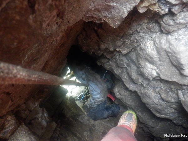 Luca scende fino al punto in cui la volta scorsa mi sono fermato. Anche per lui e’ troppo stretto, ci sara’ da lavorare.