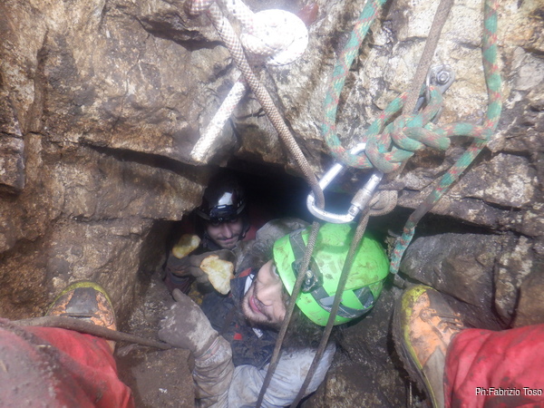 In questa nuova configurazione i nostri amici proseguono con il lavoro. Il passaggio si rivela ancora troppo stretto quindi Luca riprende a lavorarci. Io esco e vado a preparare un paio di bruschette per allietare la loro permanenza in grotta.