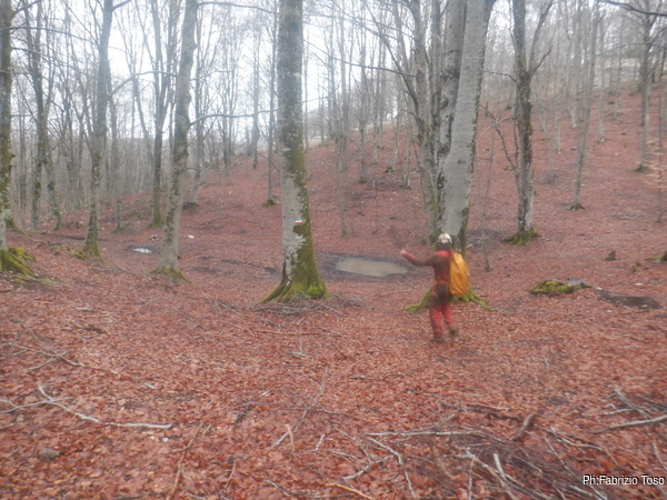 Qualche minuto di sosta e Patrizio riprende a camminare tra i massi calcarei affioranti. Dobbiamo sbrigarci a seguirlo per non perderlo. Per qualche minuto ci districhiamo tra rami, qualche rovo e tanti sassi, anche di notevoli dimensioni. Alla fine, con l’aiuto di qualche urlo raggiungiamo Patrizio ai bordi di una dolina. In fondo alla dolina si intravede un buchino che Patrizio ci presenta come “Grotta Arcobaleno”.