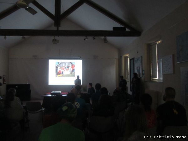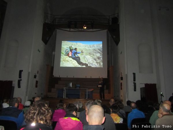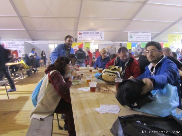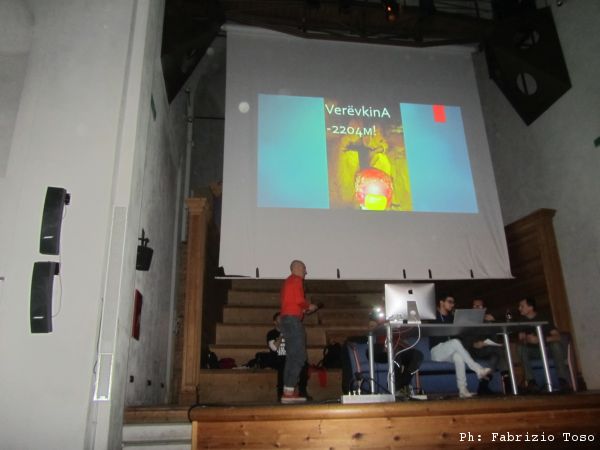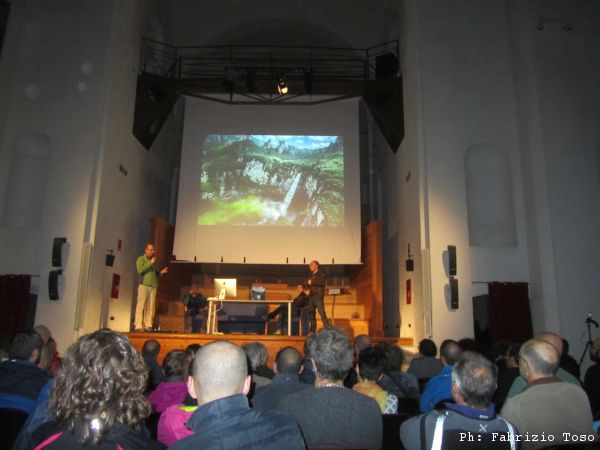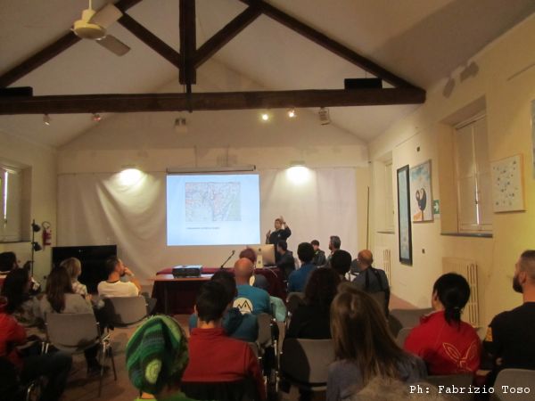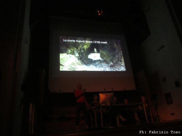 Rientro in tempo per l’intervento di Saverio sulle esplorazioni fatte sul territorio, forse l’intervento che piu’ attira gli speleo intervenuti. Luna mi guarda perplessa, non si capacita che io abbia lasciato l’aria aperta e preferisca questo posto al chiuso, rumoroso e pieno di gente.