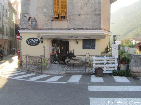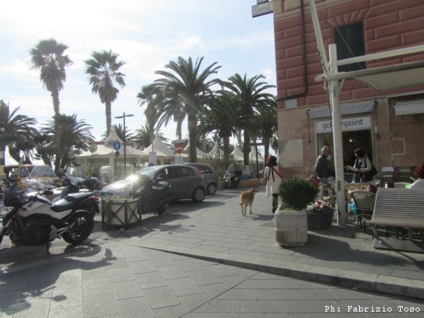 Dopo aver svolto alcune commissioni e aver visitato il mercato per quasi tutta la sua sterminata lunghezza scegliamo a casaccio uno dei ristoranti sul lungomare. Andiamo al “ristorante del brontolone”, lo scelgo per il nome curioso e perche’ c’e’ un gruppo di operai che ci stanno pranzando, segno che non puo’ essere troppo una “sola”. Il caffe’ preso ad un bar sulla piazza chiude la parentesi turistica a Finale Ligure.