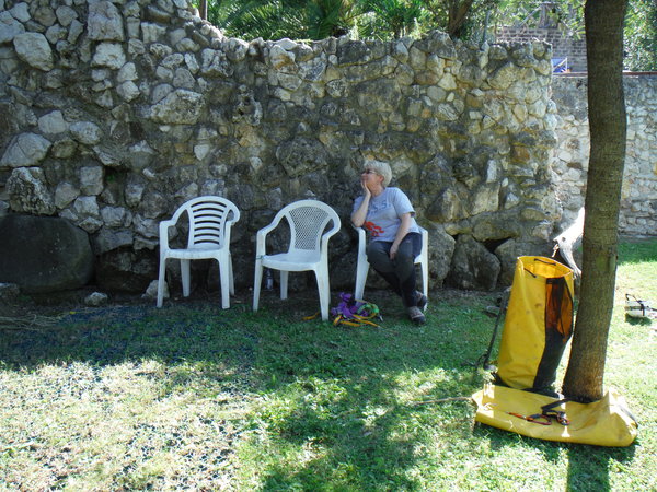 Dall’altra parte noi aspettiamo frementi il suo ritorno per vivere le nuove scoperte tramite quello che ci racconta. Nell’attesa finisco di spogliarmi anche della imbragatura e provo a passare. I miei sforzi sono inutili, mi incastro miseramente. Matteo esce, con frustrante facilita’, e reclama un poco di riposo. Riprendiamo il lavoro sulla strettoia mentre Matteo ci racconta ancora qualche particolare. Anche Filippo si riattiva ed inizia a scavare via il detrito accumulato alla base della strettoia. Quando sono stanco recupero la fotocamera e passo del tempo a scattare altre foto in giro. Ecco la mia attrezzatura in paziente attesa.