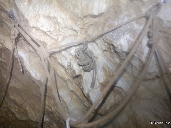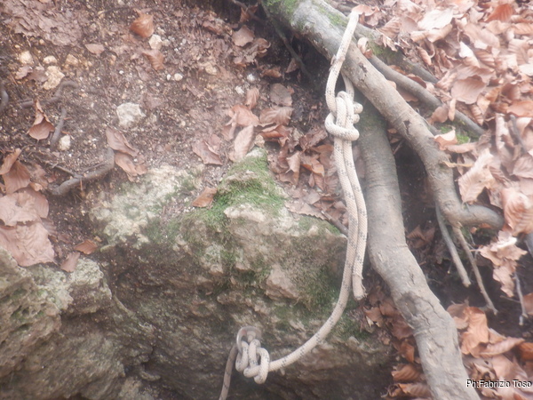 Sistemo comunque il cordino del deviatore, servira’ sicuramente in futuro. Cerco il coltellino e con un sospiro taglio la corda in maniera che a nessuno venga in mente di utilizzarla cosi’ malridotta. Il capo a valle lo attacco al cordino del deviatore, al capo a monte faccio un bel nodo per impedire che chi dovesse scendere termini la discesa con una caduta.