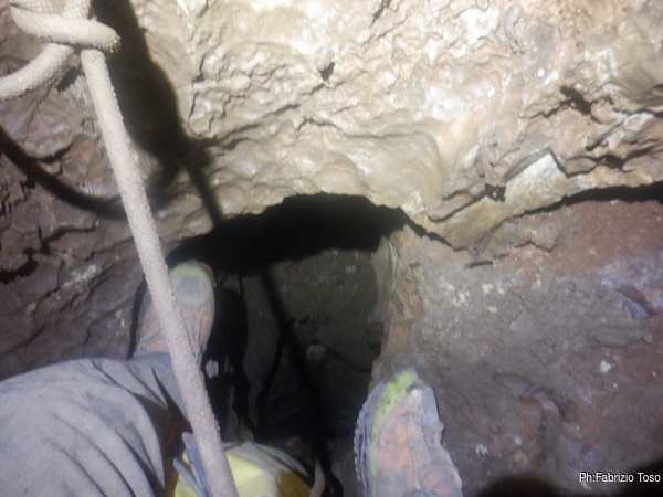 Prima di affrontare lo stretto per uscire chiedo l’aiuto dei miei amici. Nerone si affaccia sul pozzo e gli spiego che voglio passargli tutti gli ingombri possibili prima di uscire. In rapida successione gli passo gli occhiali di Gabriele, la fotocamera e la bandoliera con gli attrezzi.