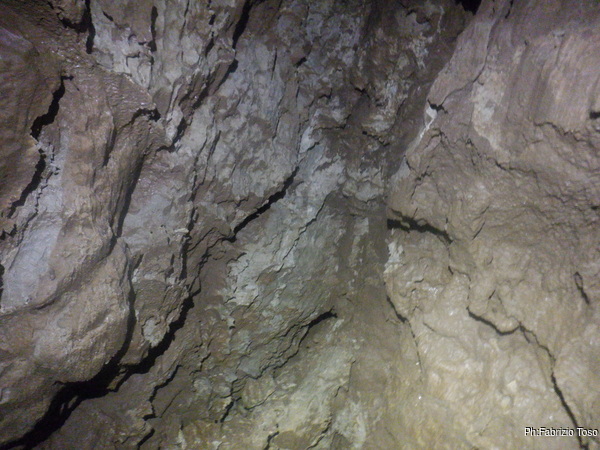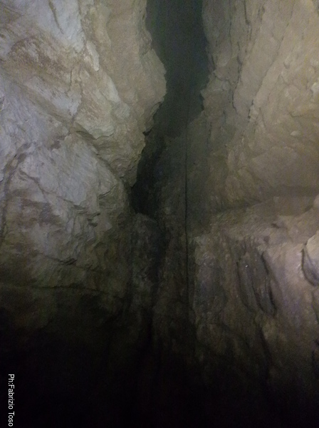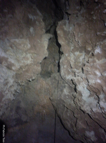 Una corta cordella in salita, poco più di un paio di metri, consente di raggiungere un primo terrazzino e poi, pochissimo più su oltre, la strettoia. Lì per lì la mia attenzione non è per l’angusto passaggio ma per il buon flusso d’acqua che, con fare sbarazzino, fuoriesce dalla crepa che dobbiamo attraversare. Aggiungo mentalmente “interessante” all’aggettivo “divertente”. Proteggo il trapano e approccio la prima breve risalita per fare in modo di non toccare, neanche per sbaglio, le delicate stalattiti di fango. E poi eccola lì: una crepa diagonale poco più larga dell’asse maggiore di un casco, dal profilo sbeccato e contorto e da affrontare arrampicando aiutati da una corda. Ci ostacola per una buona metrata. Sono evidenti i segni del duro lavoro di cesello fatti dal primo che è passato per portarla ad una dimensione “umana”. Ricerco il punto dal quale avrei più facilità a passare e, sfruttando come sicura mentale la corda che l’attraversa, tento. Passo per qualche decina di centimetri ma mi blocco contro una spalla di roccia che se la prende con il mio imbrago. Forzo un po’ ma la strettoia non mi vuol lasciar passare. Cocciutamente, senza retrocedere e senza togliere l’imbrago, decido di muovermi meno di velocità e più di pazienza. Con l’aiuto di qualche orazione supero con velocità centimetrica lo sperone che mi bloccava e salgo oltre il punto peggiore.