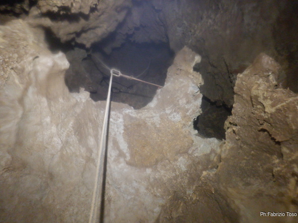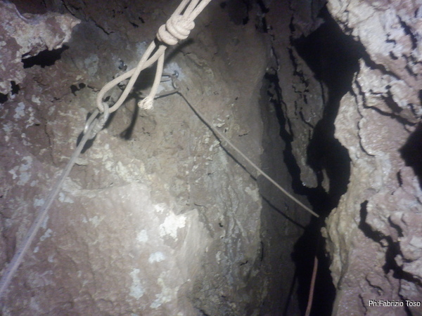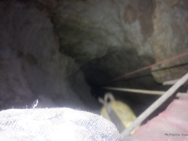 Finisco di sistemare la corda armando fuori su un sassone e appena sulla verticale del pozzo con un fix. Entro. Il passaggio iniziale per me e’ impegnativo, ma la gravita’ aiuta, vedremo al ritorno quante imprecazioni mi fara’ consumare. Il pozzo scende verticale, inizialmente stretto ma non troppo. Dopo circa 5 metri si allarga, non in maniera eclatante ma sicuramente diventa molto piu’ comodo. Scendendo, come sempre, faccio cadere eventuali sassi pericolanti o instabili.