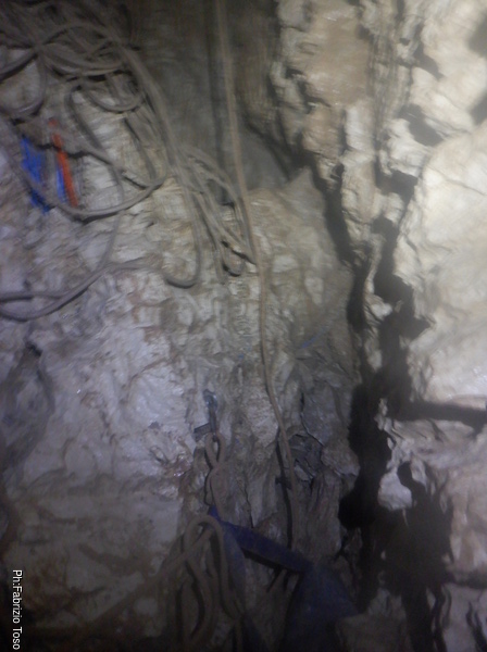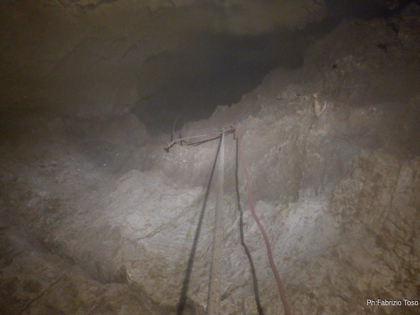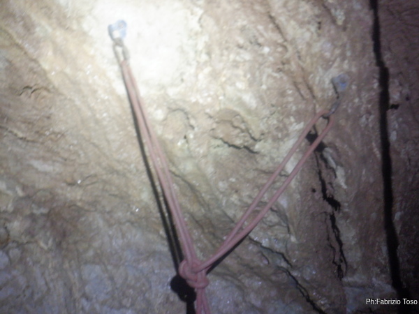 Alla base del P25 inizio subito a salire per non far aspettare troppo Luca ma dopo pochi metri decido che devo assolutamente spostare piu’ in alto il deviatore messo frettolosamente la volta scorsa. Metto subito in azione il mio proposito, ma lo faccio male poiche’ mi faccio cadere di mano il kevlar del deviatore. Per evitare di dover scendere mi sistemo su una cengia poco sopra di me e chiedo a Luca il piacere di recuperarlo e portarmelo.