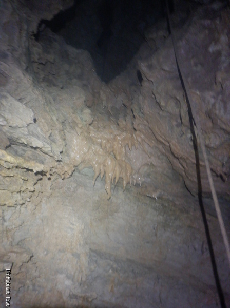 Qualche minuto dopo aver salutato Angelo e Linda, arriva Bibbo. Lo informo che ragazzi sono andati avanti e in cambio mi indica la nostra risalita e la sua strettoia ad attenderci. “Ho dovuto togliere l’imbrago”, ripete nel breve racconto del suo primo passaggio attraverso l’ostacolo, mi indica le graziose piccole stalattiti di fango che danno nome all’area, ci da l’appuntamento di fine giornata e ci salutiamo.