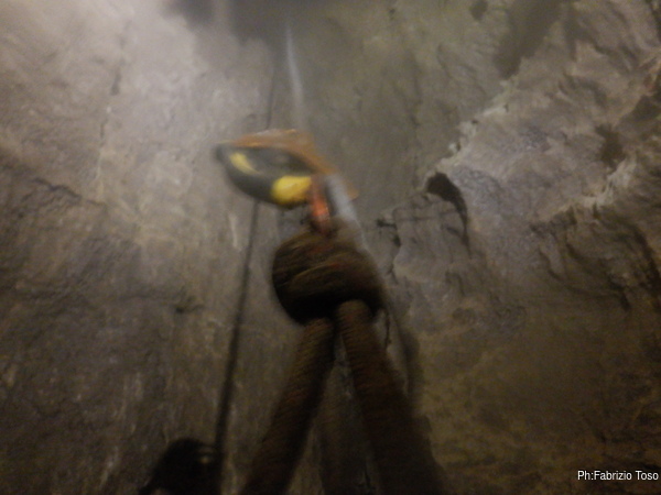 Avverto fuori che inizio a salire e che, una volta nei pressi dell’ingresso dovranno darmi una mano. Salgo controllando le pareti per togliere eventuali sassi pericolanti che mi fossero sfuggiti durante la discesa. Nemmeno due metri dalla base del pozzo, su una sporgenza di roccia trovo anche la lente mancante, ripongo anche lei nel taschino.