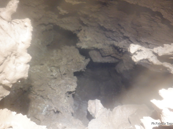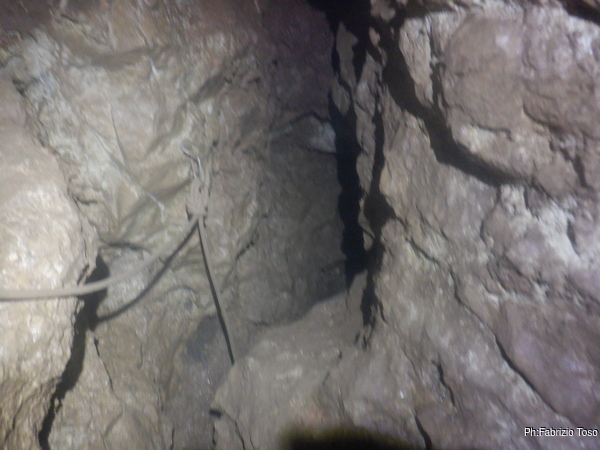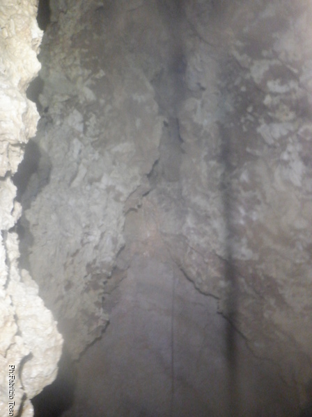 A un metro dall’ingresso trovo una bella sorpresa, una spaccatura laterale sembra portare ad un pozzo parallelo. Alla prova del sasso sembra profondo almeno come quello gia’ sceso. Cerco di dargli una allargata col mio fido martello ma ben poco riesco a fare. Anche affacciarmi sulla verticale del pozzo risulta difficile quindi mi astengo. E’ sicuramente interessante perche’ l’aria sembra uscire da la’. Per ora mi limito a fare una foto all’imboccatura del pozzo. Lo ispezioneremo la prossima volta.