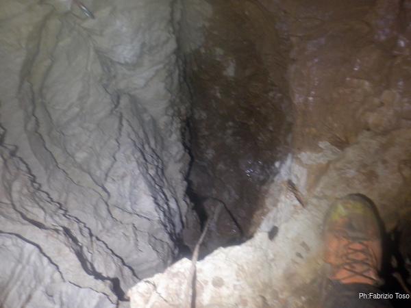 Raccolgo le mie cose e risalgo velocemente il pozzo sulla cui sommità c’è il passaggio da ispezionare. Un lato del pozzo è sotto una caduta di acqua, la stessa che poi alimenta il flusso che attraversa la strettoia, ma la risalita è stata fatta dal lato opposto. Sulla sommità del pozzo cerco il passaggio che mi avevano indicato e del quale mi erano state mostrate delle foto. Lo trovo: una crepa, laterale al di sotto del pozzo non più larga di una spanna nei suoi primi 30-40cm di sviluppo, che continua allargandosi a dimensioni quasi umane per zigzagare via nel buio dopo un paio di metri, lasciando supporre che oltre ci sia un altro piccolo ambiente. È da dove arriva tutta l’acqua: di sicuro non va verso il basso, di sicuro va cesellata la frattura di ingresso – mentre rifletto Silvana è al freddo che mi aspetta – di sicuro non è il giorno giusto per forzare il passaggio che è praticamente a tetto, approcciandolo dal basso e in solitaria.