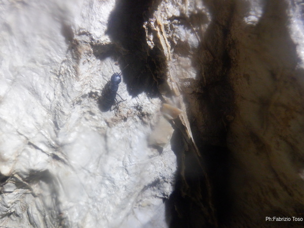 Alla base del pozzo un piccolo cono di terra fresco fresco, tutta roba caduta durante il nostro scavo. Il resto del piano e’ ingombro di sassi sia caduti ora che nei tempi andati. Sulla parete trovo un simpatico ragnetto che cerco di fotografare mentre lui scappa precipitosamente dalla mia luce.