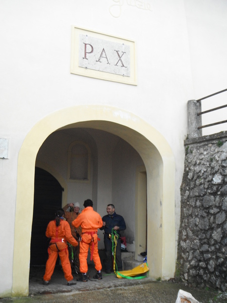L’appuntamento e’ alle 10.00 ma quando arrivo a S. Oreste, alle 9.30, sono gia’ tutti li’. Trovo Netta che si tiene al calduccio in macchina ed il resto della banda a presidiare la pizzeria! Dopo i saluti pensiamo a rifocillarci con pizza e cappuccini, ci procuriamo pappa ed acqua per la grotta e quindi saliamo. Visto che tira un venticello fresco alquanto ci prepariamo nel solito androne sotto il segno di pace, come testimonia la foto!