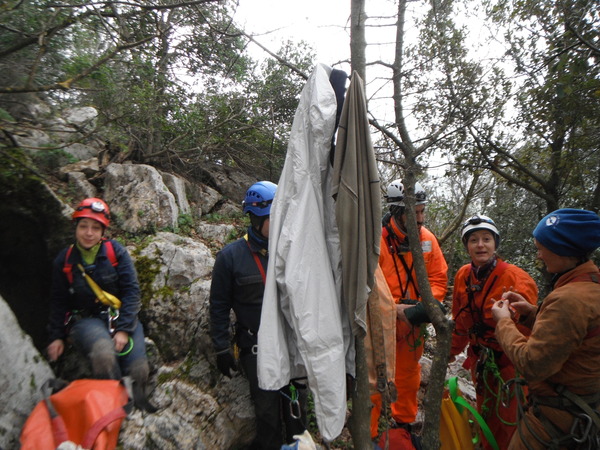 Dopo poco Simone G. ci raggiunge. Come da accordi iniziamo subito la prima prova delle radio e, dopo qualche urlo tra interno grotta ed ingresso il ripetitore viene collegato ed acceso e riusciamo a farle funzionare (la mia radio era sul canale sbagliato e non me ne ero accorto!). Bellissimo!