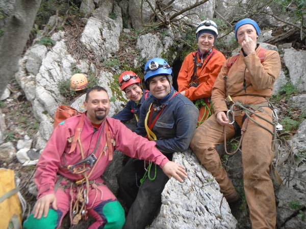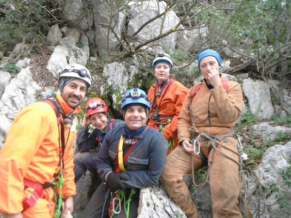 Arriviamo all’ingresso della grotta. Come al solito ho sudato come non mai e sono gia’ fradicio. Mi cambio mettendo dei vestiti asciutti, indosso la tuta (pesa almeno un chilo in piu’ del solito, ma e’ bellissima, l’ho rappezzata tutta con pezze e silicone!) e l’attrezzatura mentre Netta da’ un’ultima controllata ai “pupi”. Tutti pronti!?! Un po’ di foto tutti assieme e poi si entra.