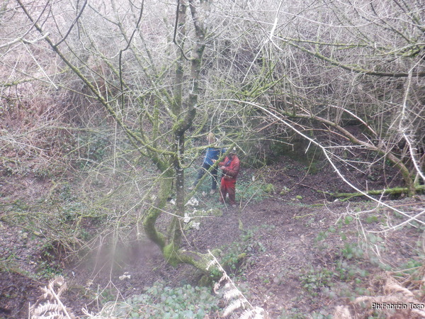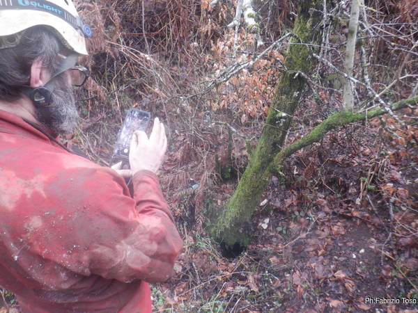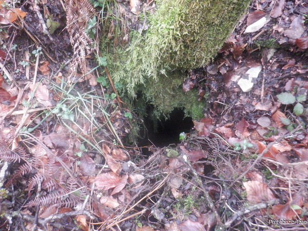 Lo scavo e’ terminato ma la giornata ancora no. Gabriele una mezz’ora prima che Nerone ed io uscissimo dalla grotta e’ scomparso nel bosco sotto e quando usciamo e’ ancora a zonzo. Dopo molti richiami finalmente risponde e ci da’ una buona notizia, ha ritrovato la “grotta della vaccheria”. Ci dice di raggiungerlo e portare una corda. La grotta e’ data per una profondita’ di 5 metri e da quanto e’ stretto l’ingresso non sembra sia stato sceso. Prendiamo il punto e le foto quindi risaliamo.